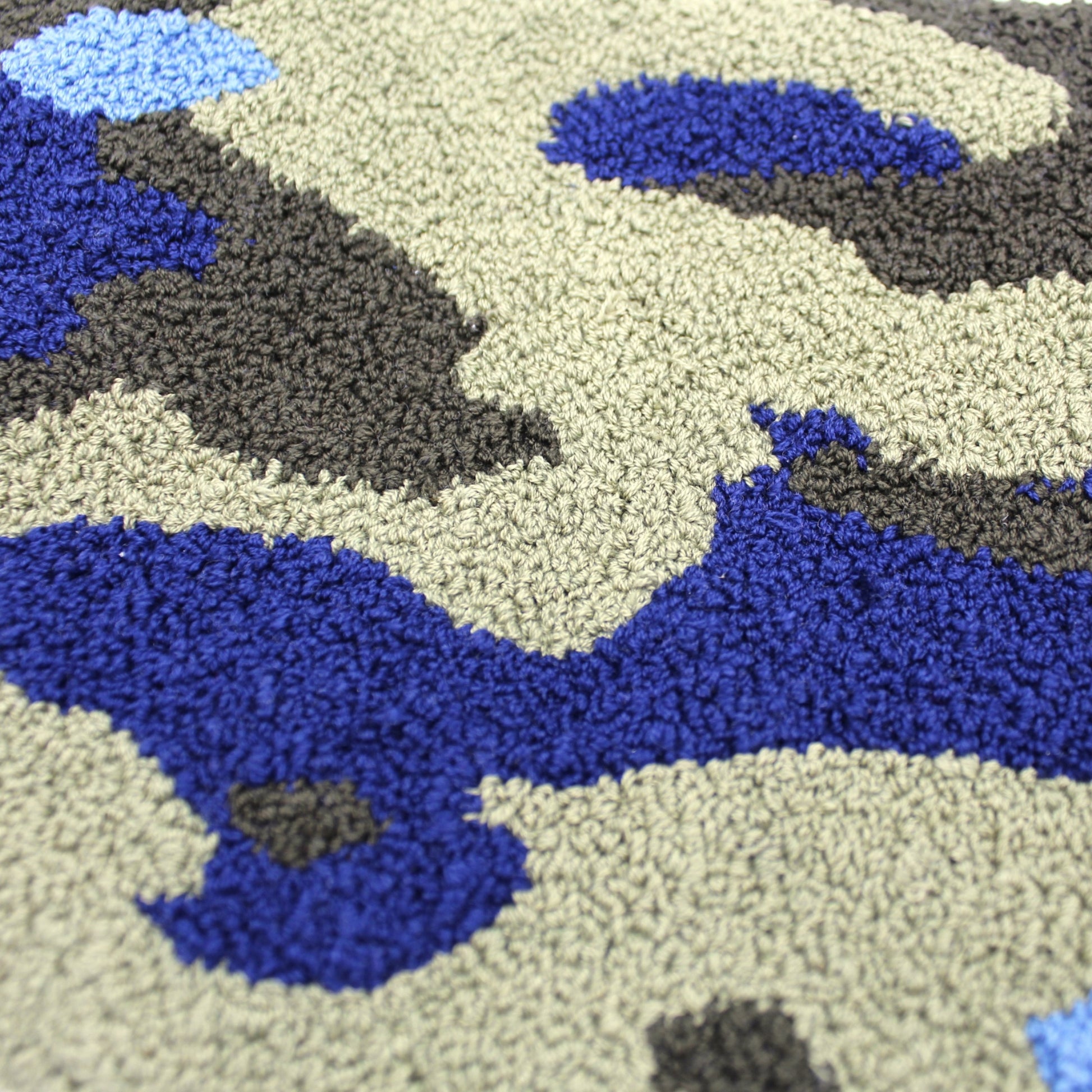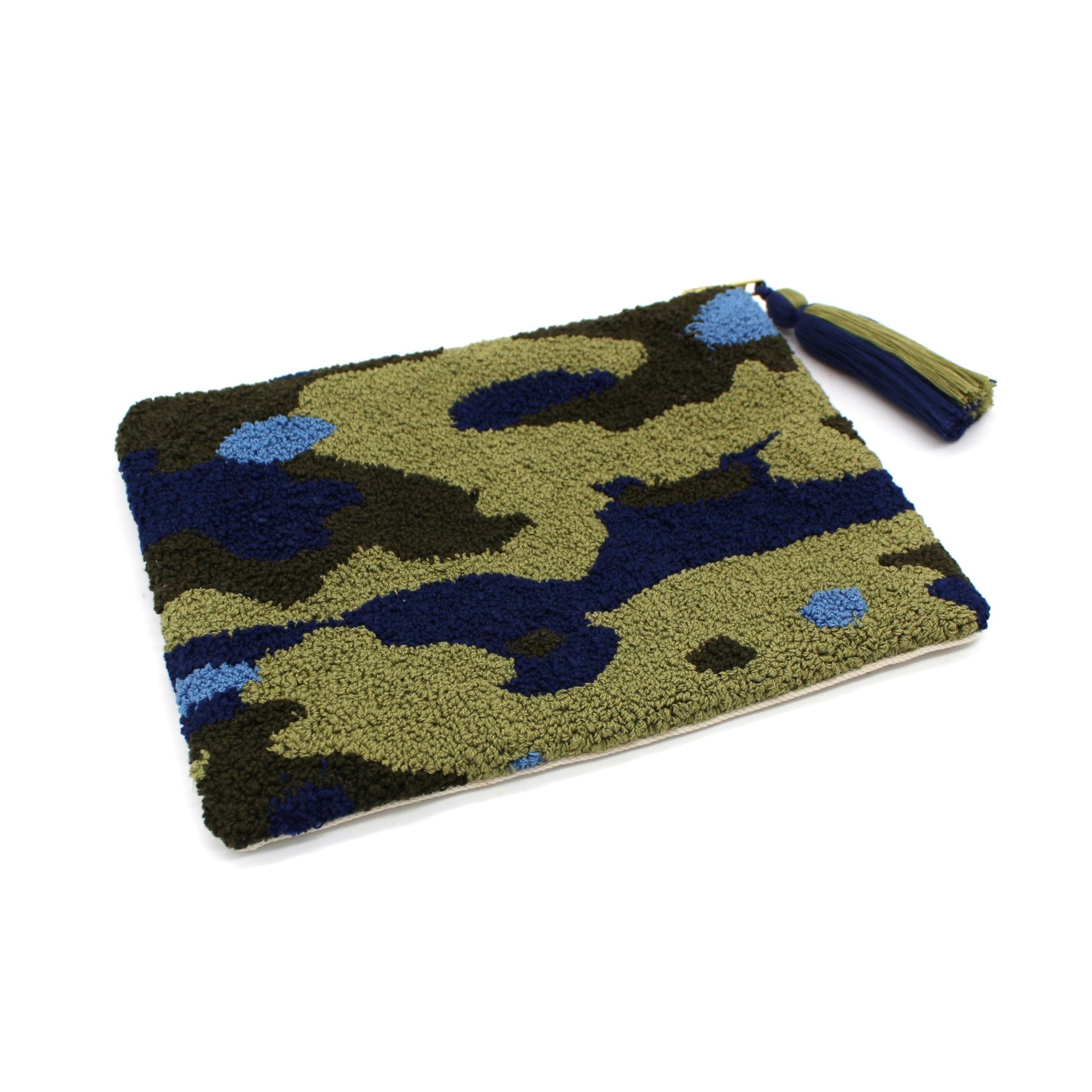 Beautiful hand-embroidered clutch using punch-needle technique similar to rug hooking, this cosmetic bag has a magnificent texture. The same camouflage design comes in 3 vibrant color combinations: Blue, Green, Gray.